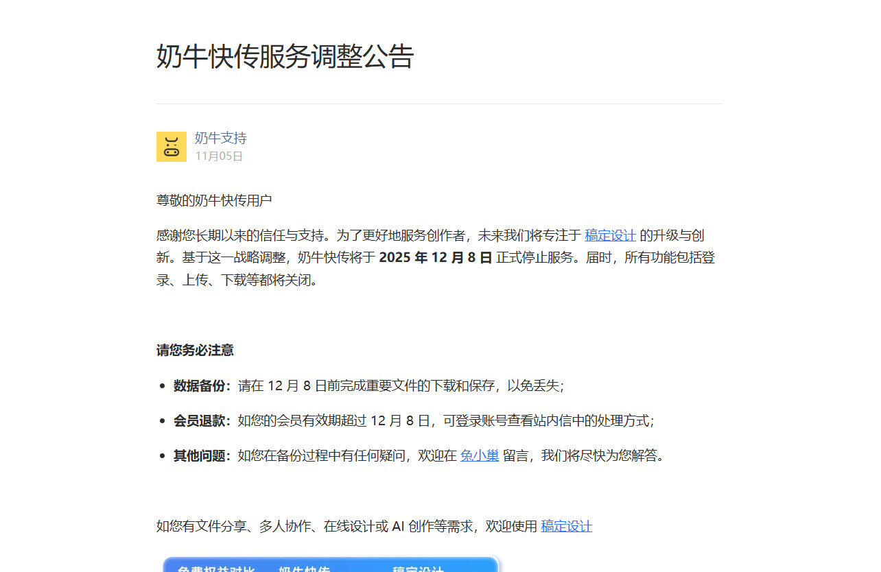 奶牛快传官方公告,将在2025年12月08日正是停止服务。届时,所有功能包括登录、上传、下载等都将关闭。有需要备份文件的请尽快前往下载保存。